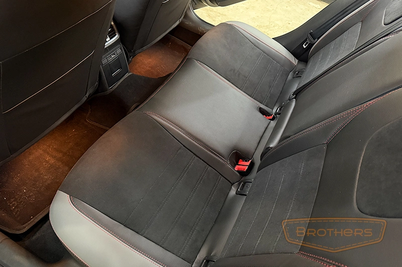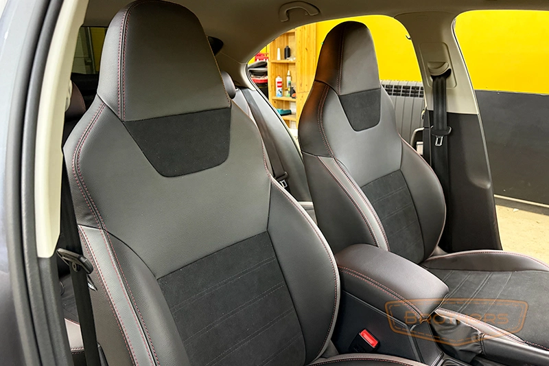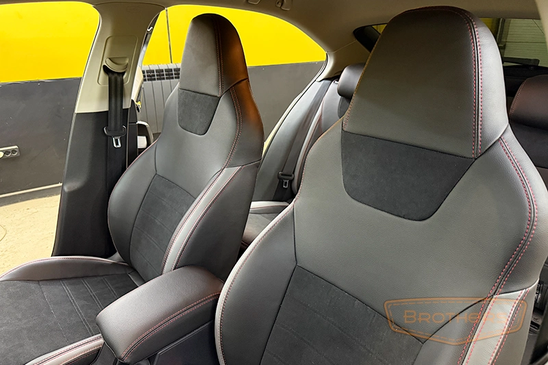 Не препятствуют срабатыванию AIRBAG, Высокая износоустойчивость, Фирменная двойная отстрочка в каждом комплекте чехлов, Четкая посадка на сидения.